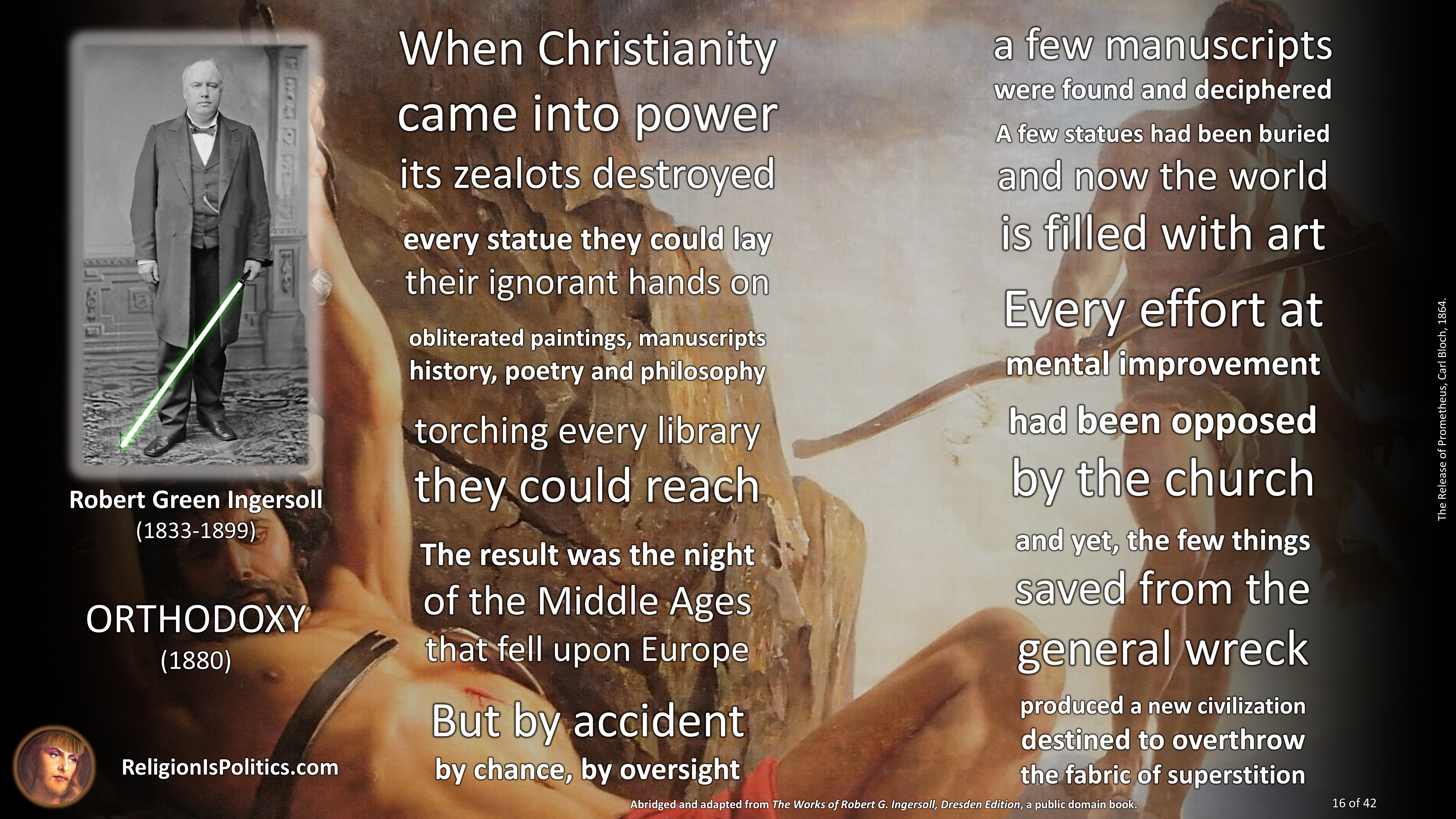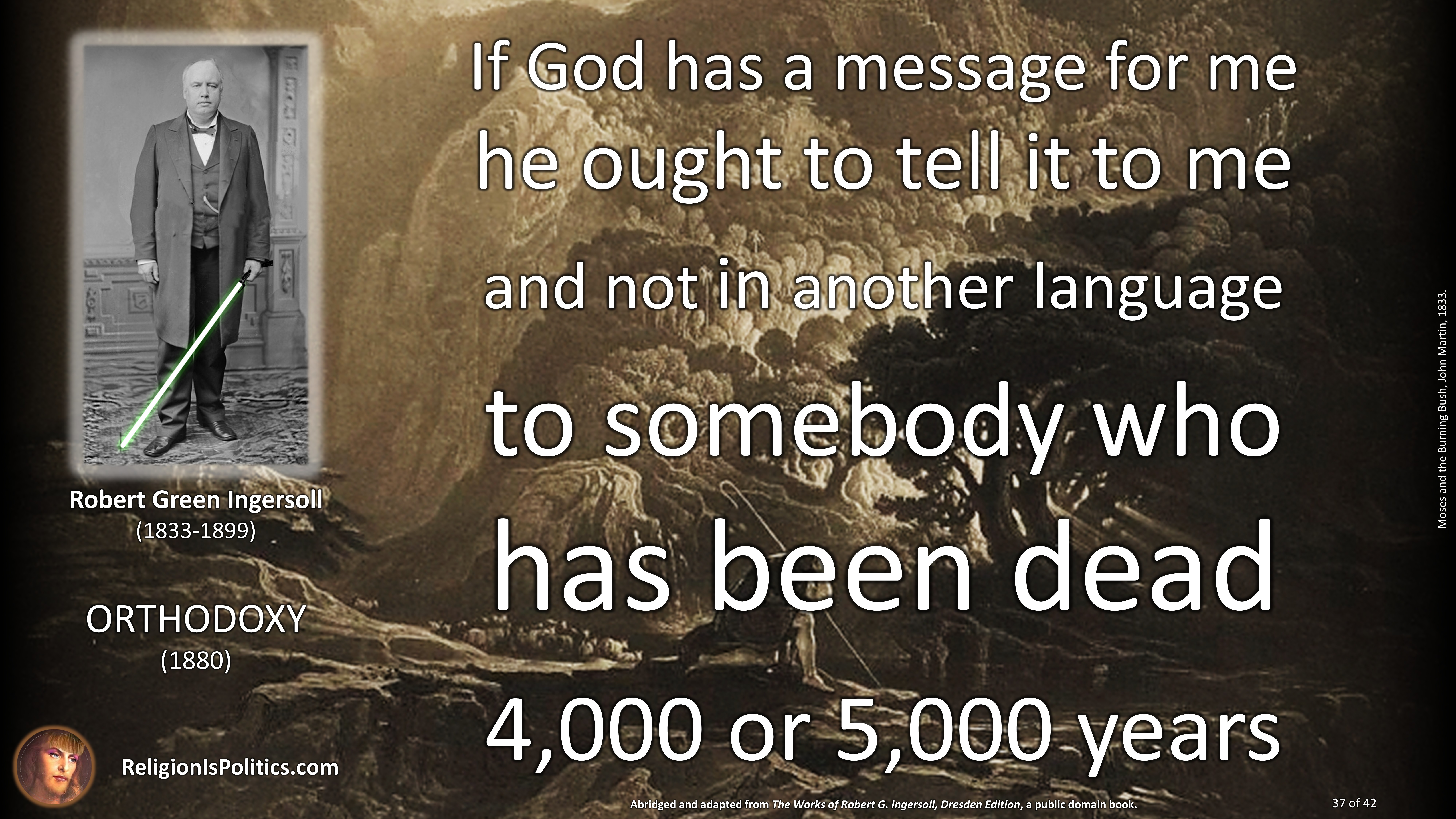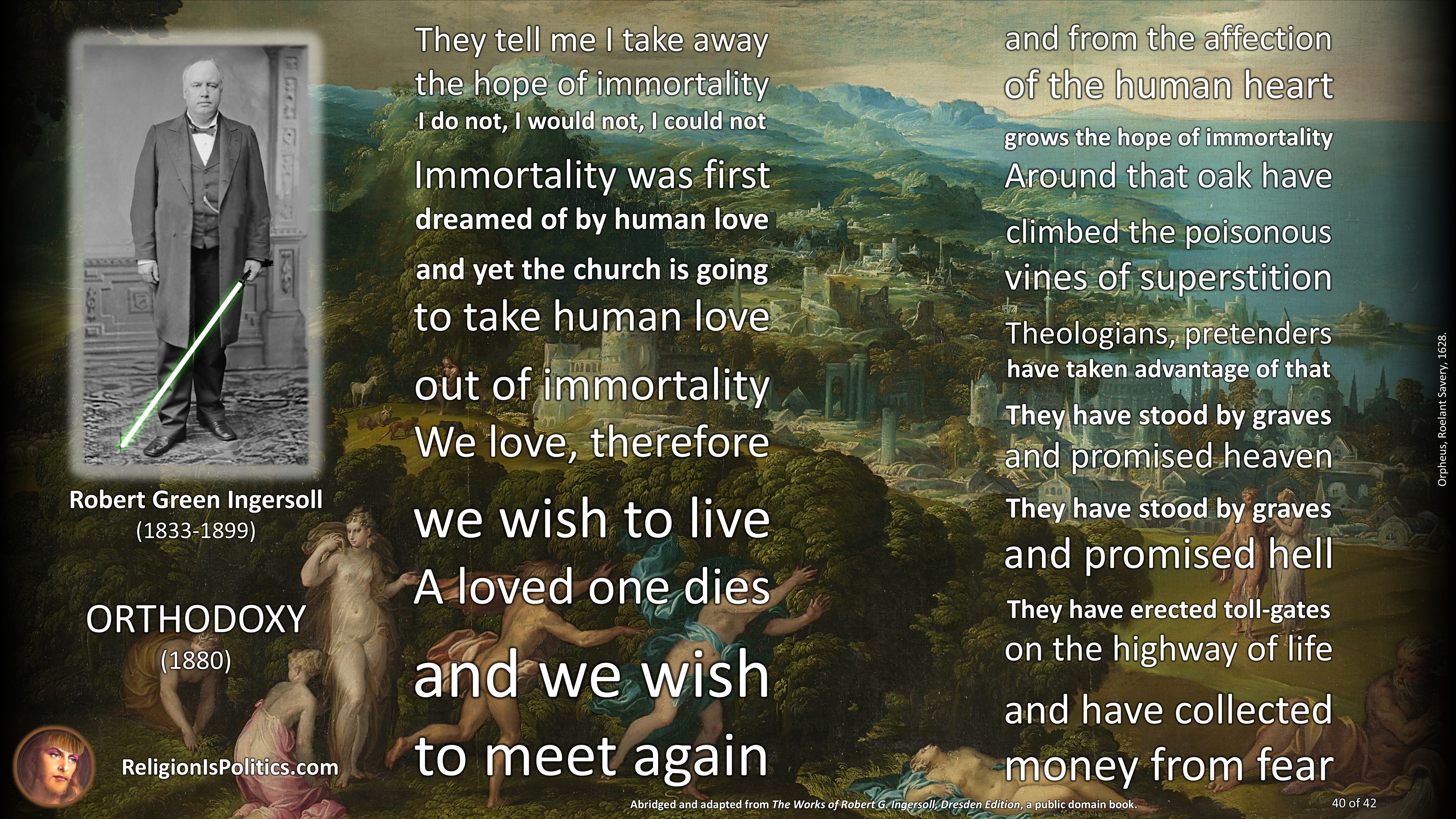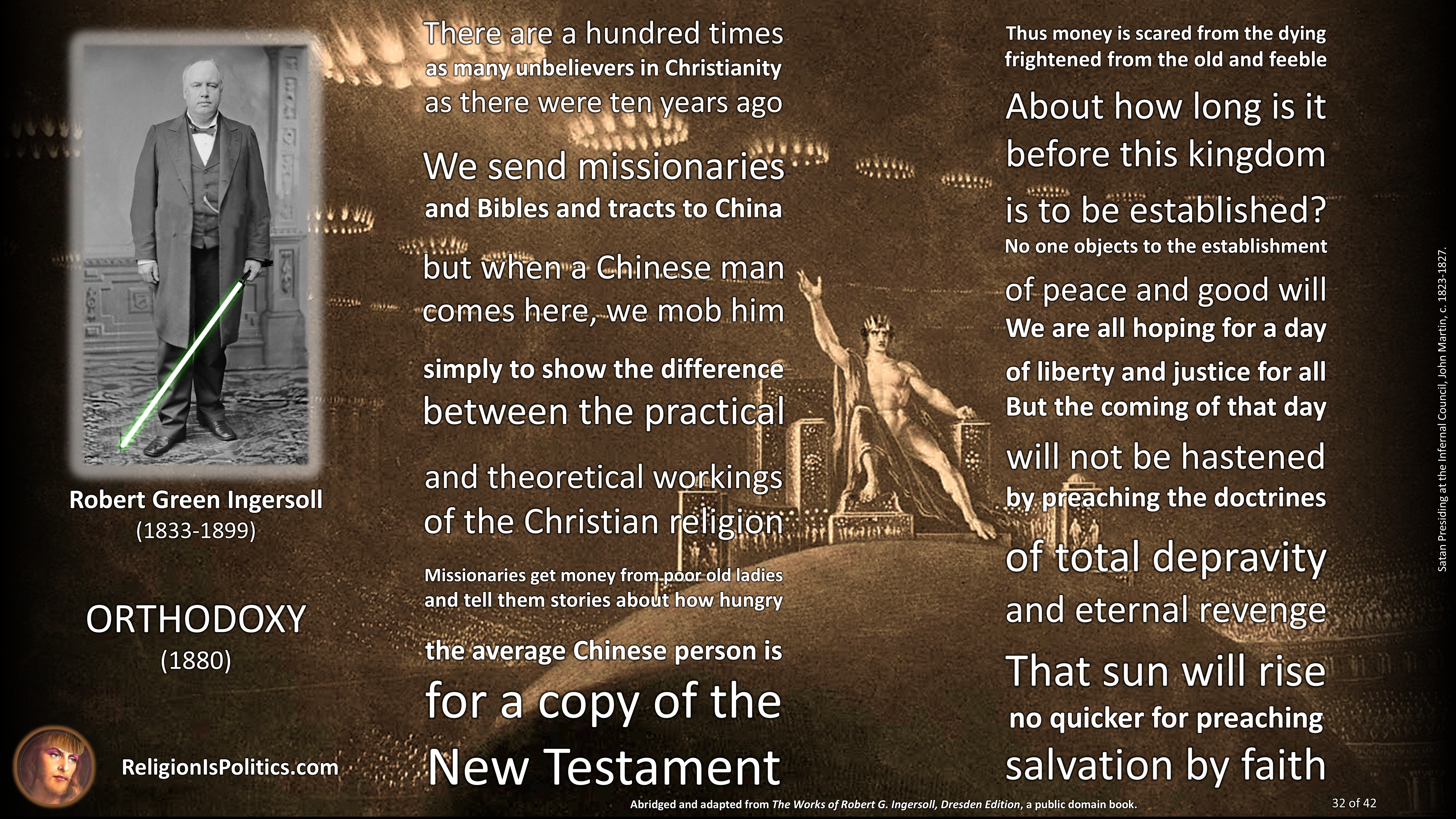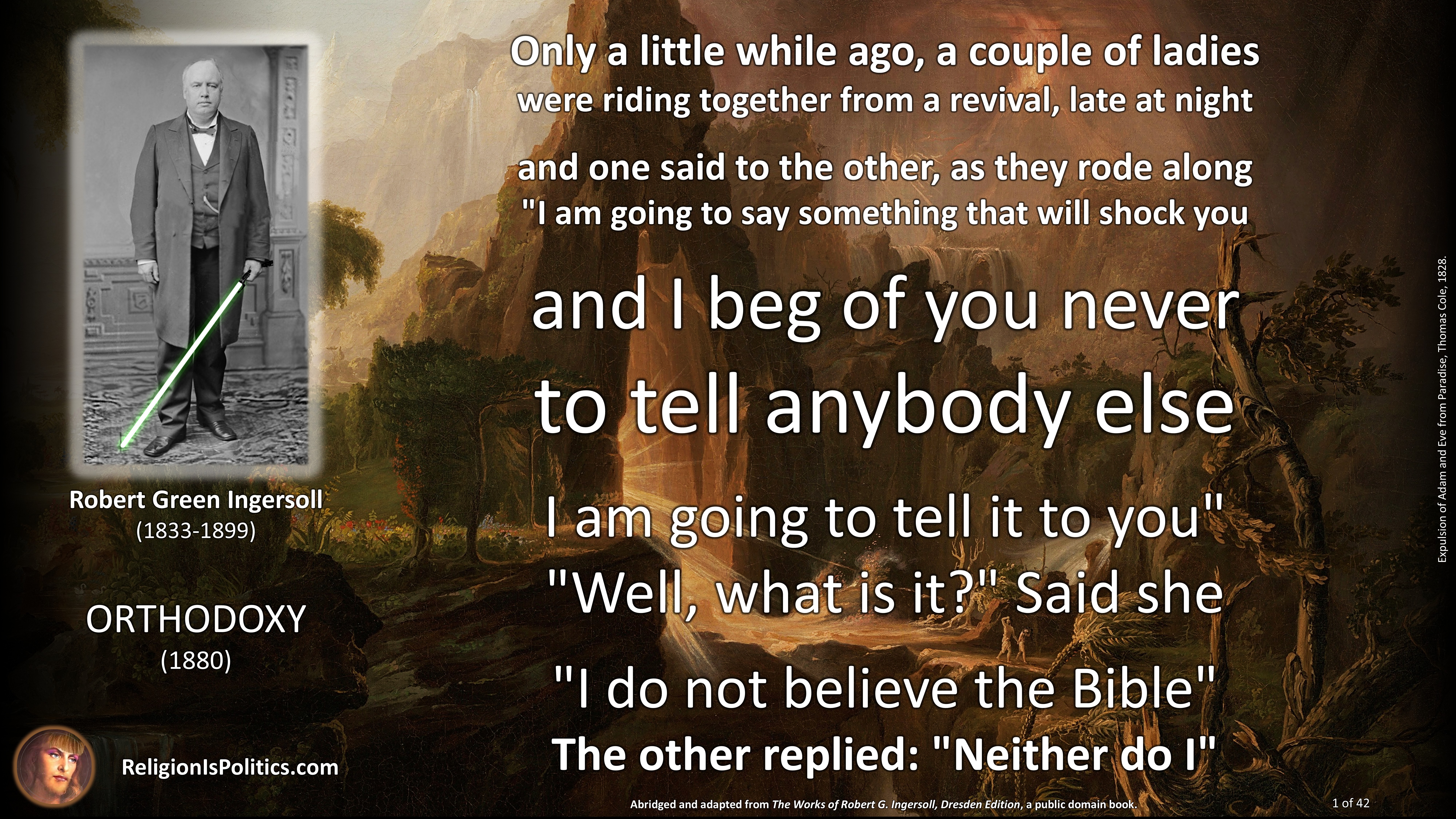 But these people were not yet known as “Fundamentalists.” Otherwise, Ingersoll could have called this speech “Fundamentalism,” and it would have better conveyed his themes. They are resonant again in 2025.