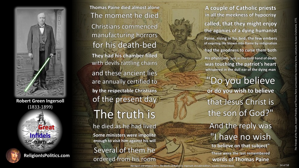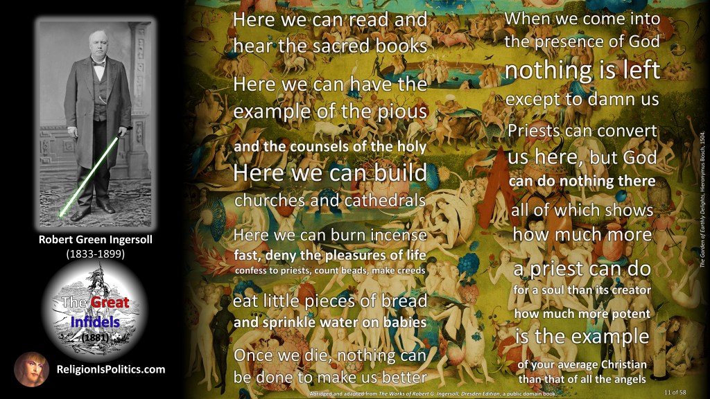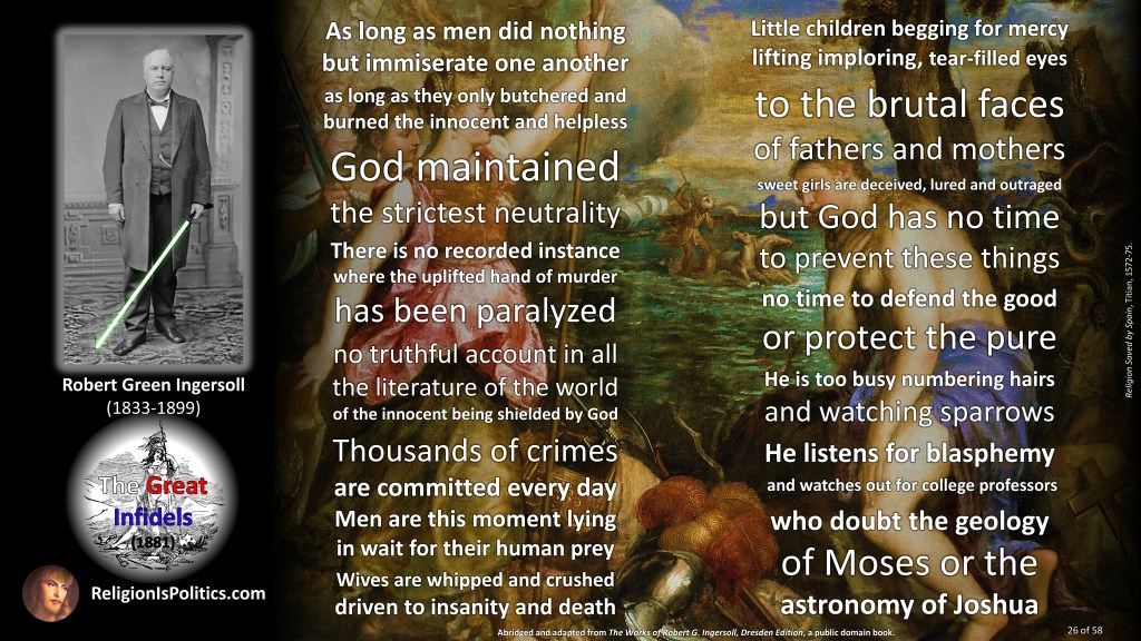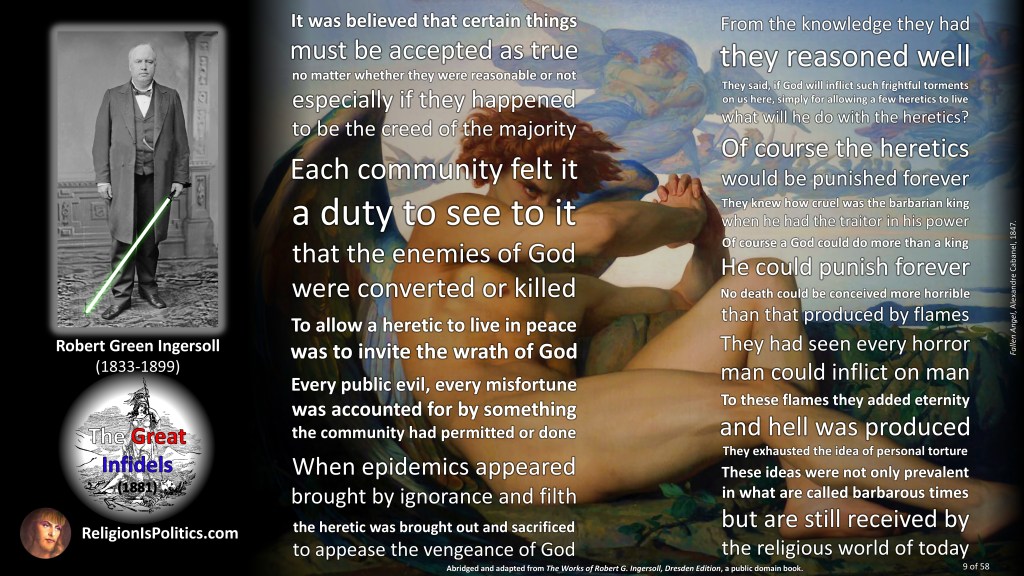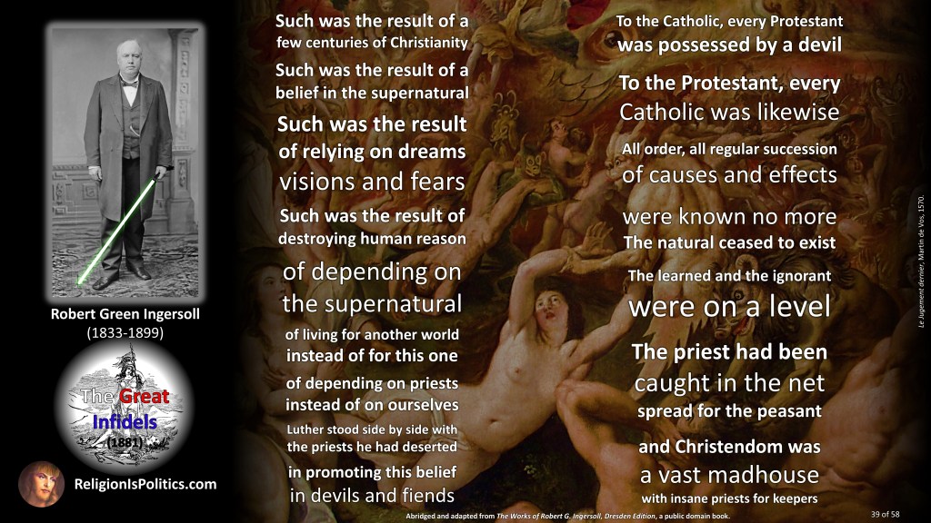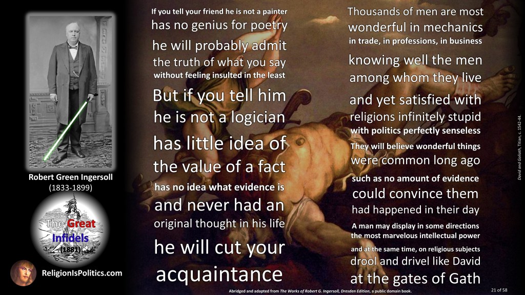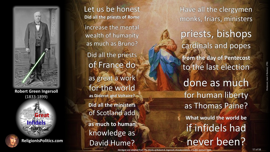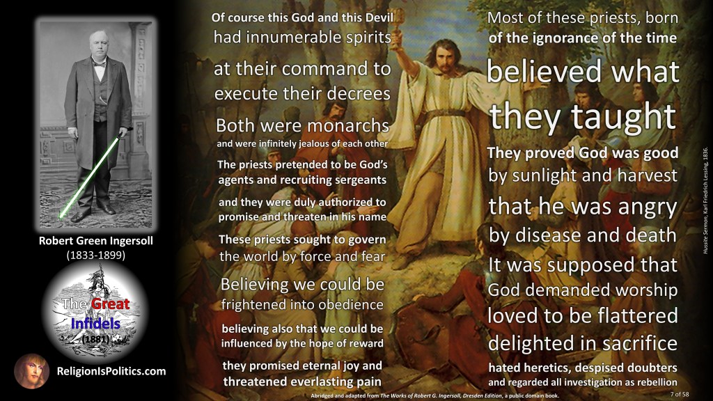 As the son of a minister, Ingersoll heard thousands of sermons in his life, and heard many times all the same slanders against typically the same five infidels. Without minds like theirs we’d still be under medieval theocracy.