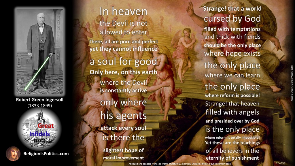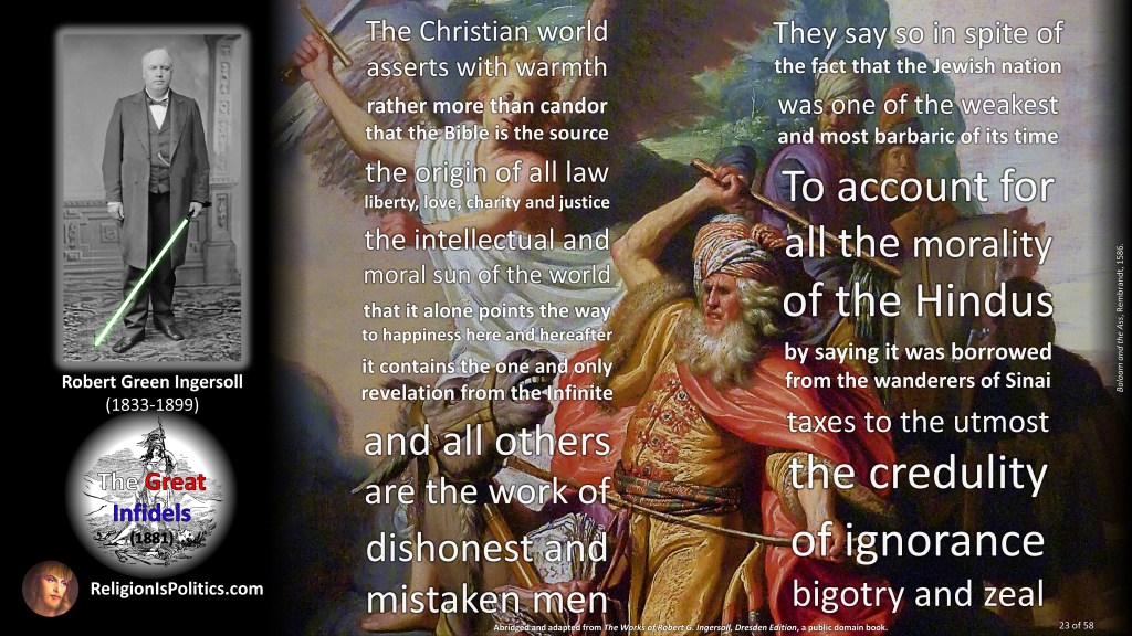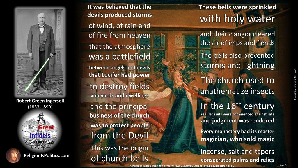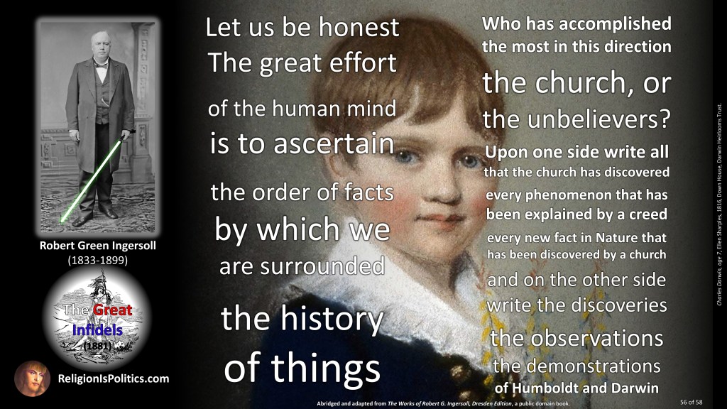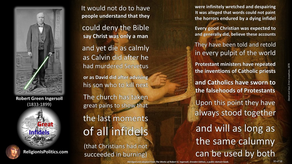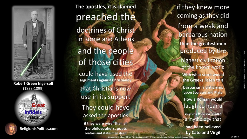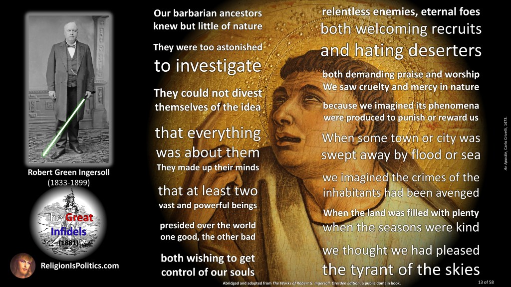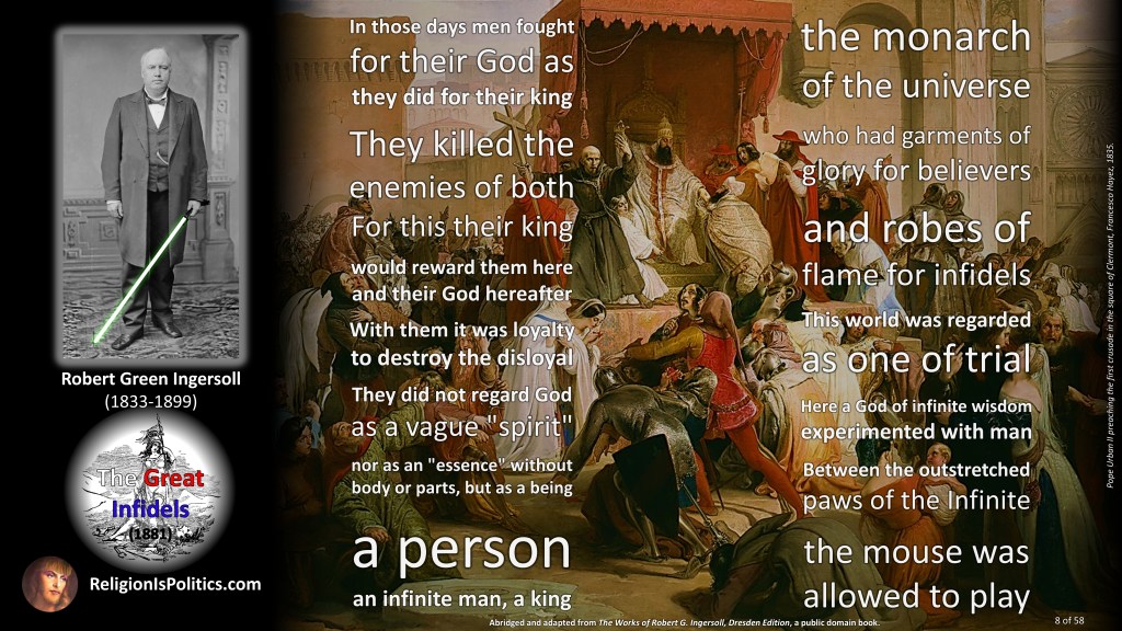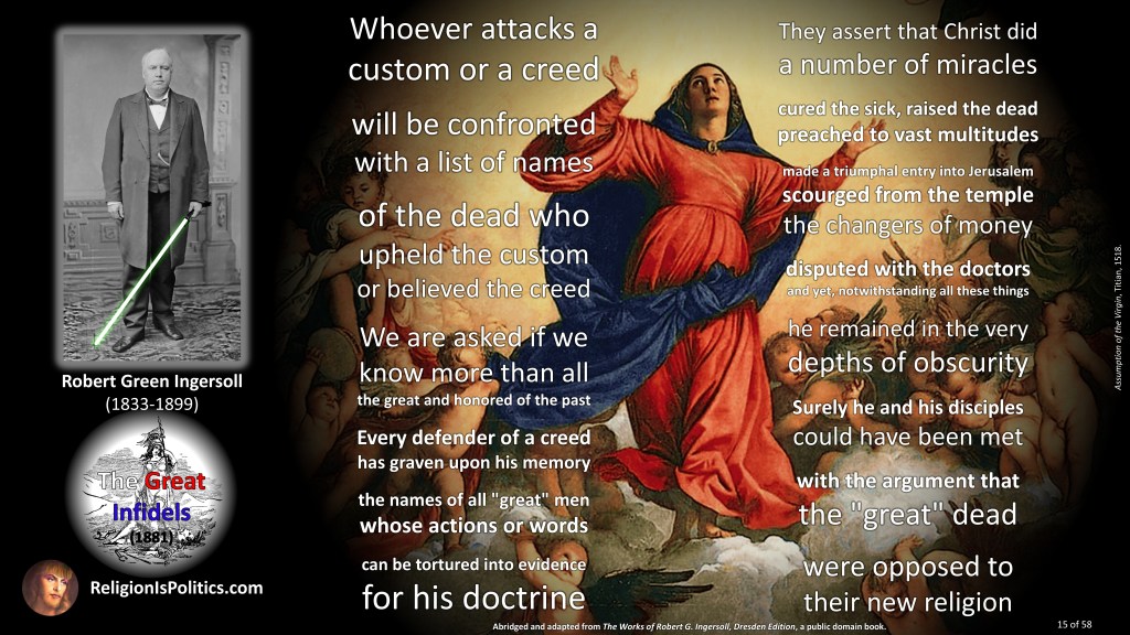 As the son of a minister, Ingersoll heard thousands of sermons in his life, and heard many times all the same slanders against typically the same five infidels. Without minds like theirs we’d still be under medieval theocracy.