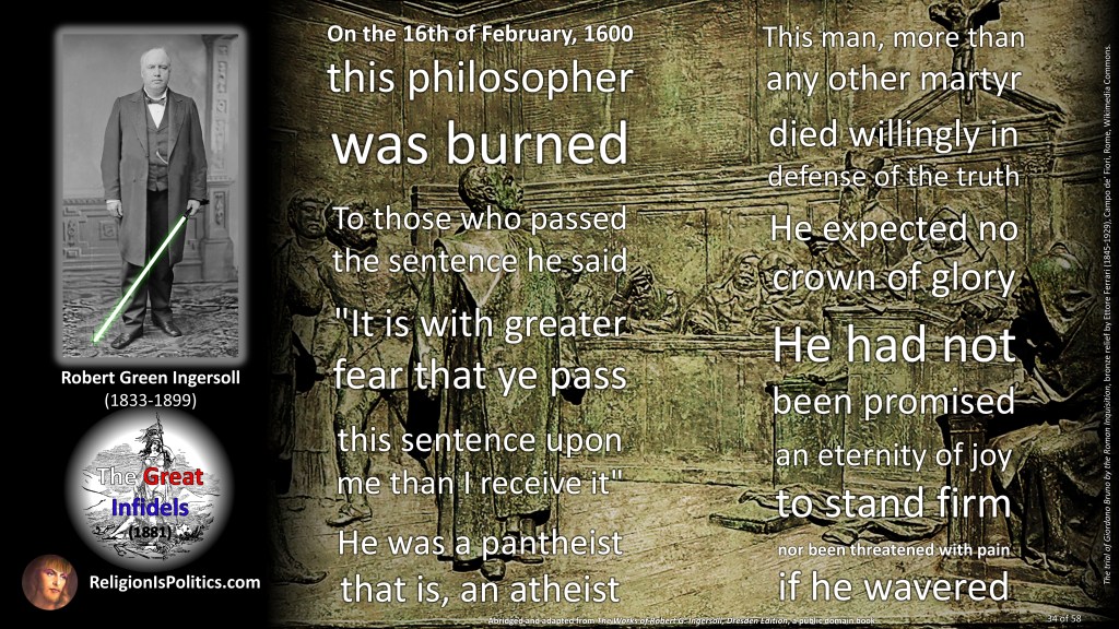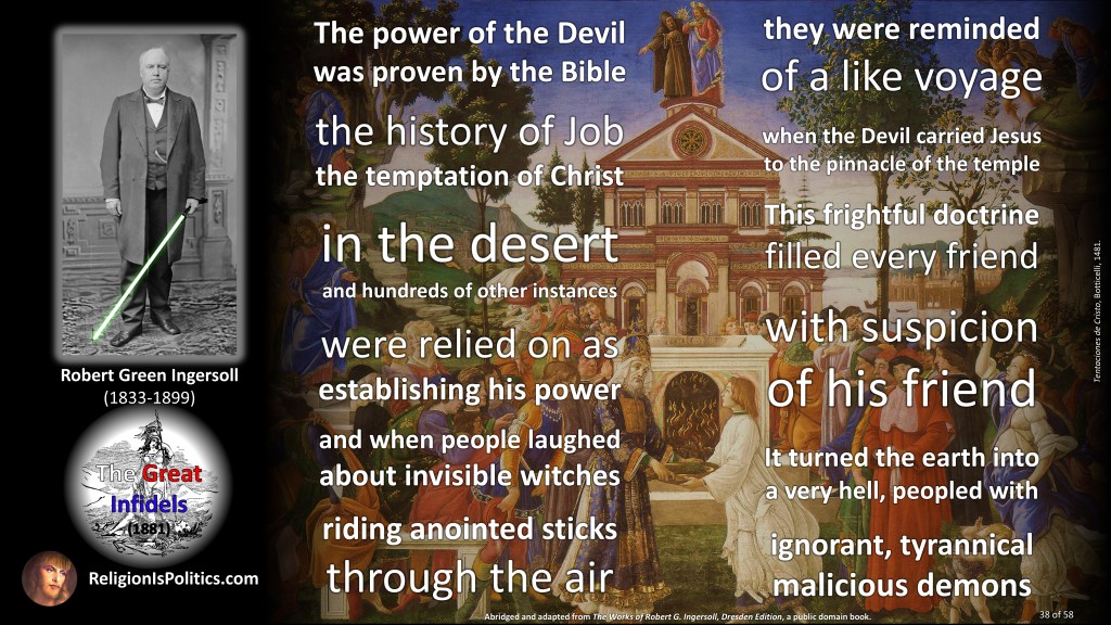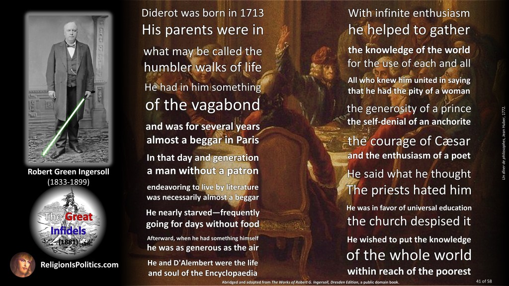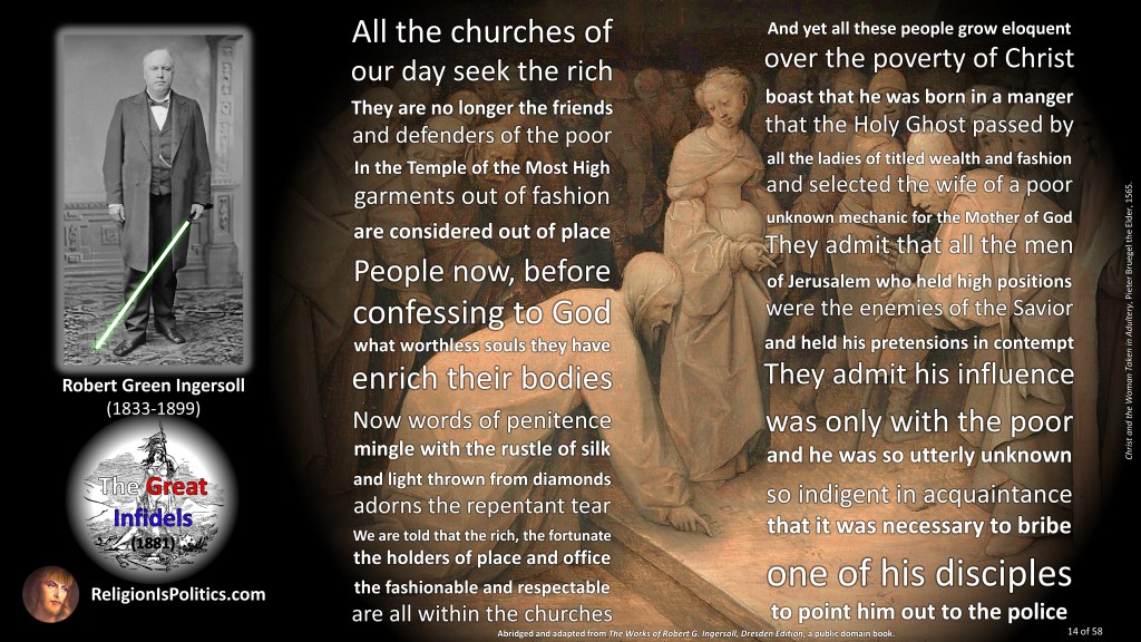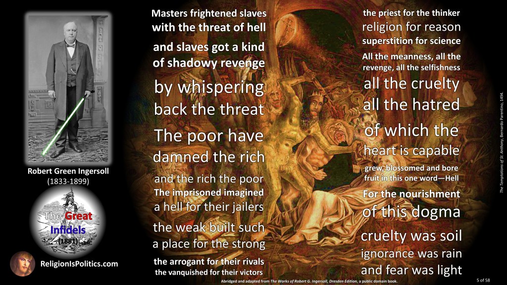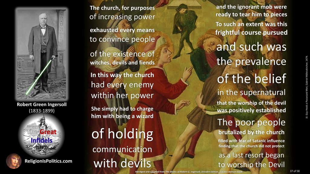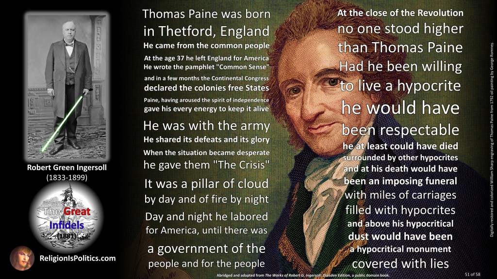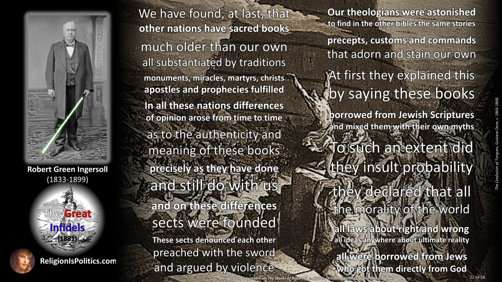 As the son of a minister, Ingersoll heard thousands of sermons in his life, and heard many times all the same slanders against typically the same five infidels. Without minds like theirs we’d still be under medieval theocracy.