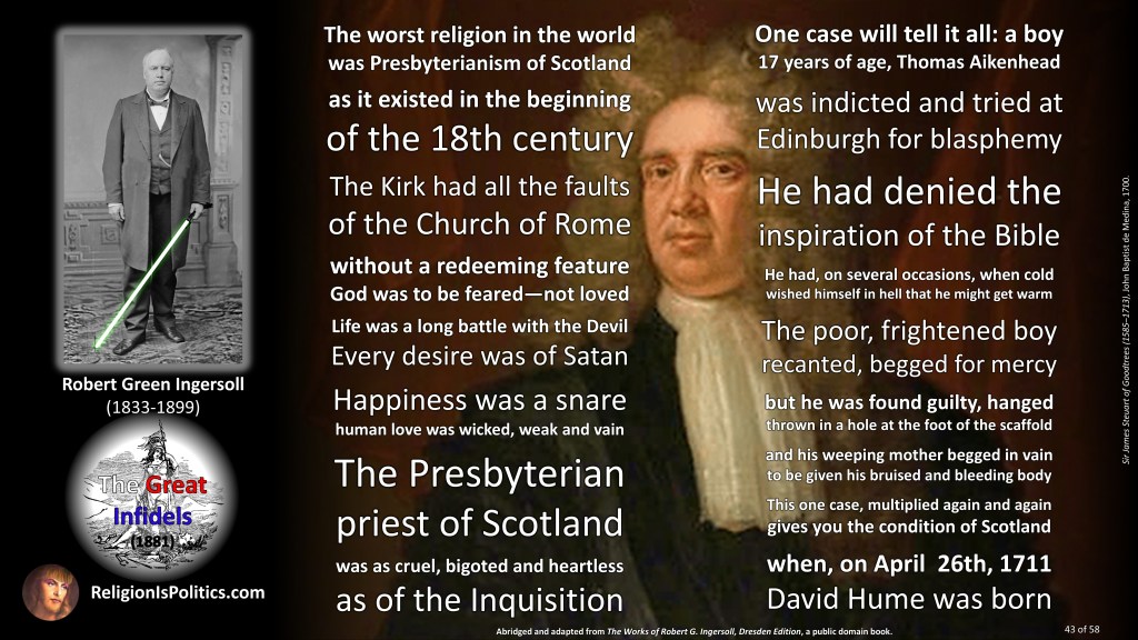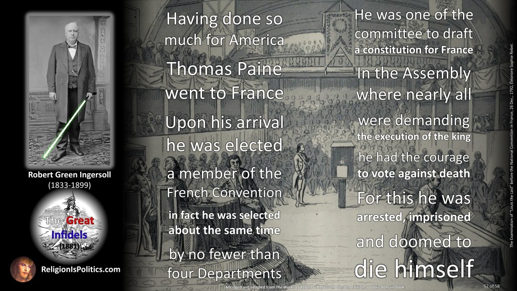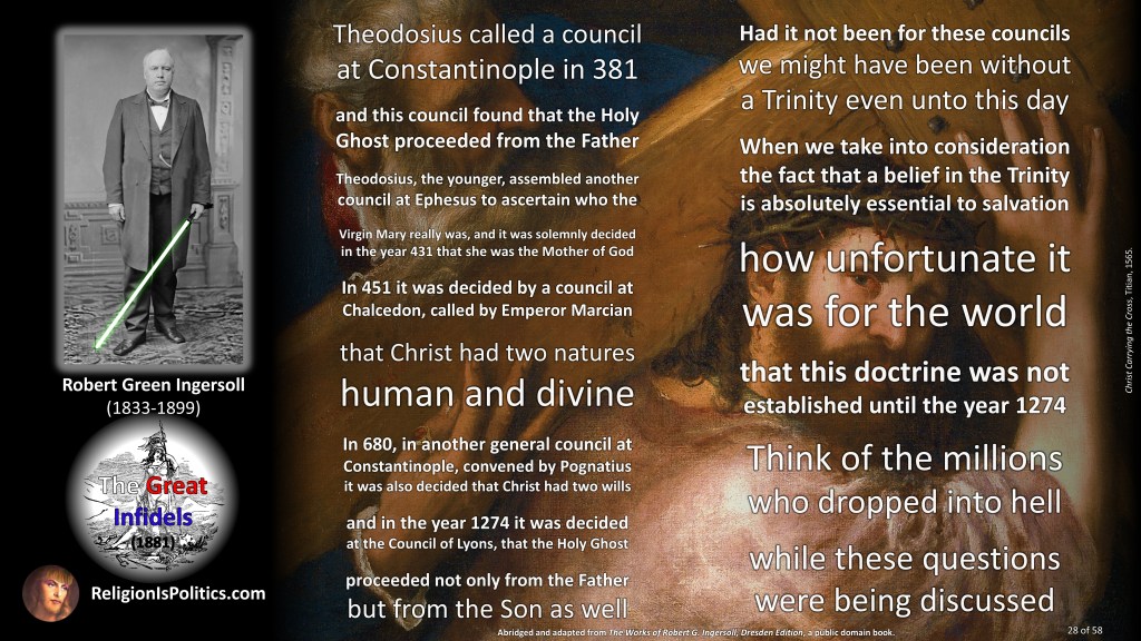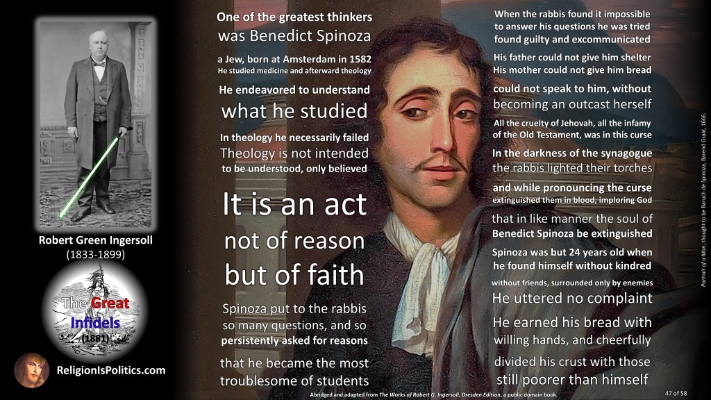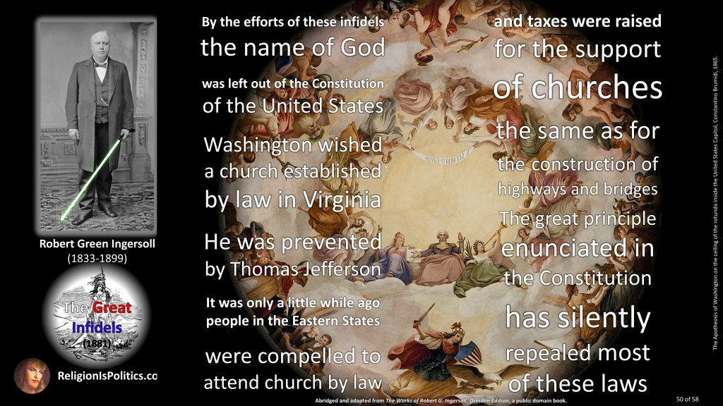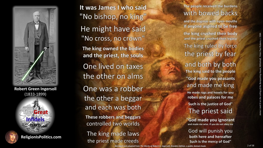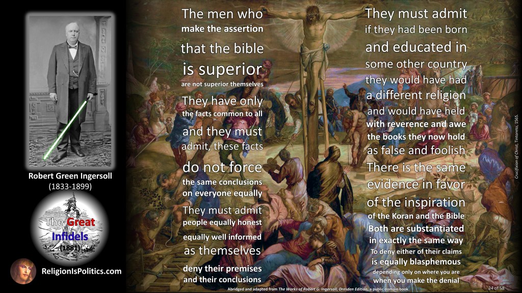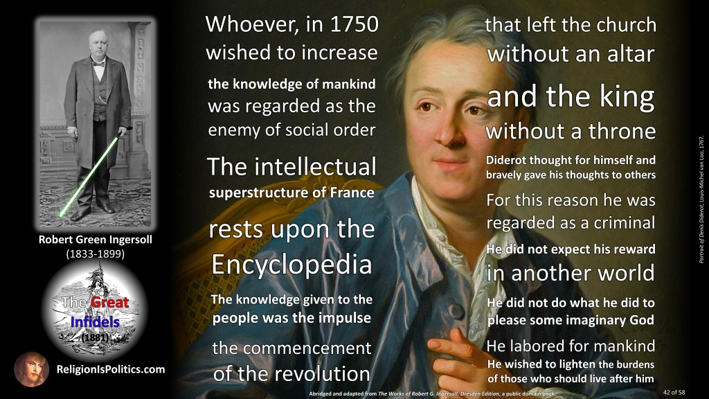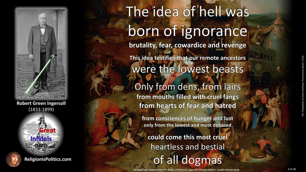 As the son of a minister, Ingersoll heard thousands of sermons in his life, and heard many times all the same slanders against typically the same five infidels. Without minds like theirs we’d still be under medieval theocracy.